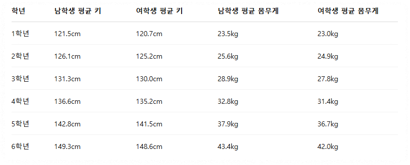 오늘은 2025년 기준, 국내 초등학생의 평균 키와 몸무게를 학년별로 알려드리고, 성장 관리 팁까지 함께 소개해 드릴게요.