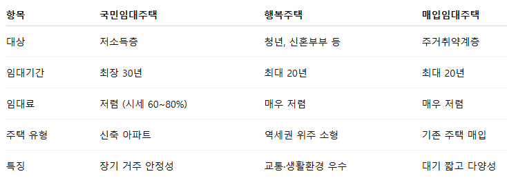 📊 국민임대 vs 행복주택 vs 매입임대주택 비교표