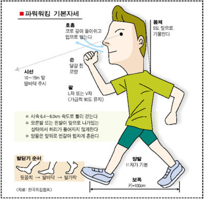 - 어깨는 펴고, 팔은 90도 각도로 흔들기